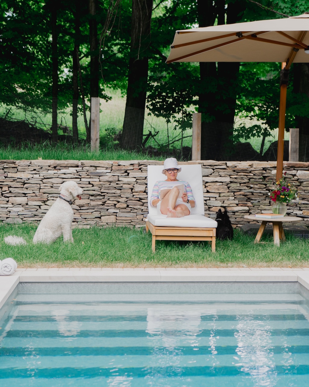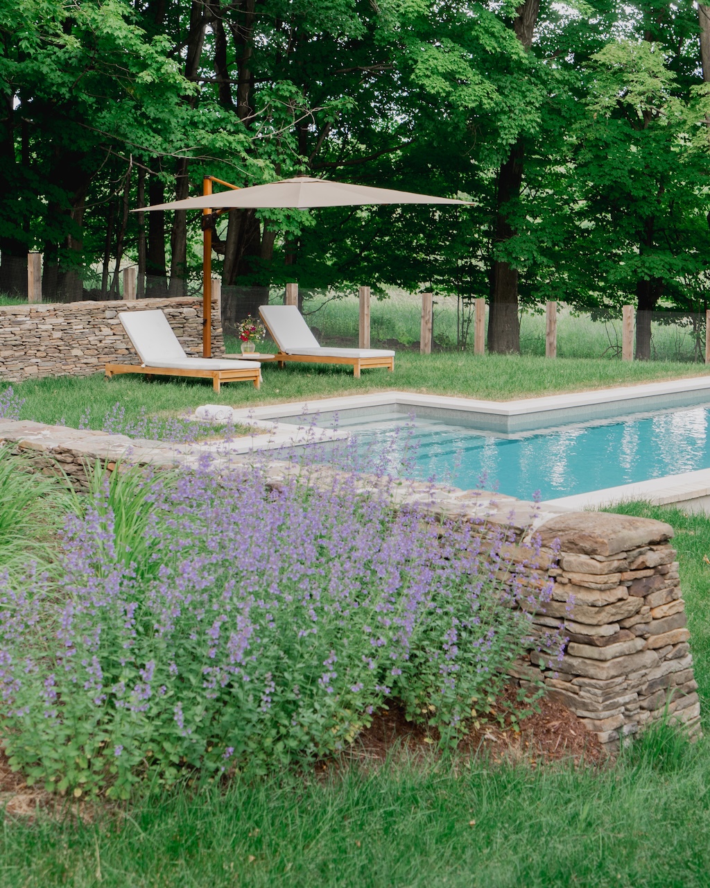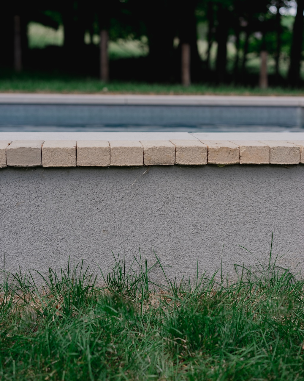 La piscine creusée constitue l’élément central de l’espace. Plutôt que de chercher à en faire un geste architectural dominant, la conception a misé sur une intégration douce au terrain existant. Le bassin s’inscrit ainsi dans la topographie naturelle : sa forme épurée et ses lignes discrètes laissent toute la place au paysage environnant. Lors de l’excavation, la découverte d’un affleurement rocheux en surface a d’ailleurs transformé l’orientation du projet. Plutôt que d’éliminer la contrainte, le niveau de la piscine a été rehaussé. Ce choix a permis de magnifier le relief, de créer une présence plus sculpturale du bassin et d’offrir de nouvelles perspectives sur la propriété. Ce geste simple est devenu l’une des signatures du projet.
