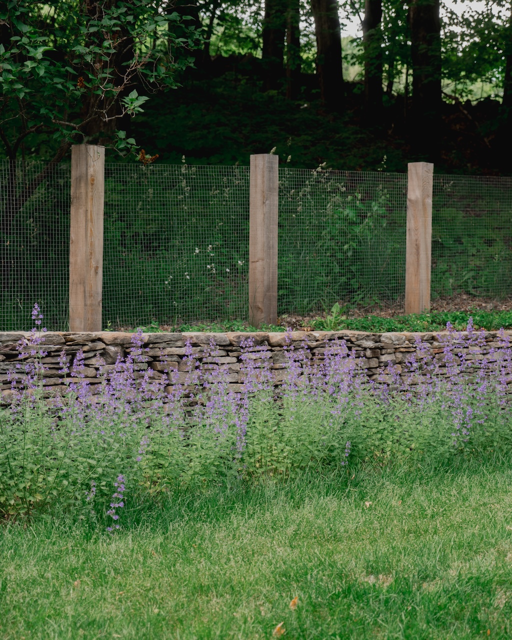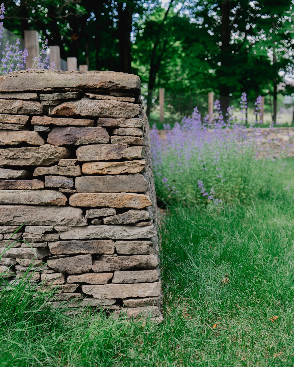 Les matériaux utilisés célèbrent à la fois la durabilité et la mémoire du lieu. Les murets en pierre des champs, réalisés selon les techniques traditionnelles, structurent l’espace tout en respectant la nature des sols et le caractère ancestral des environs. Leur texture irrégulière et leur teinte chaude apportent une profondeur visuelle qui évolue au fil des saisons.
