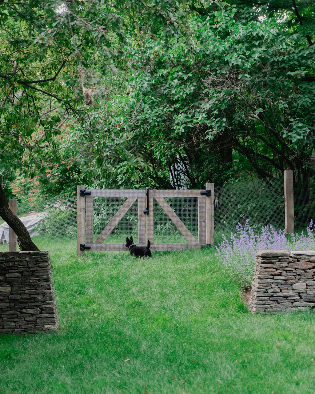 À proximité, une clôture de pruche inspirée des anciennes fermes locales, mais réinterprétée avec une maille métallique fine, assure la délimitation du site. Elle constitue un clin d’œil assumé au patrimoine rural tout en s’inscrivant dans un langage résolument actuel.