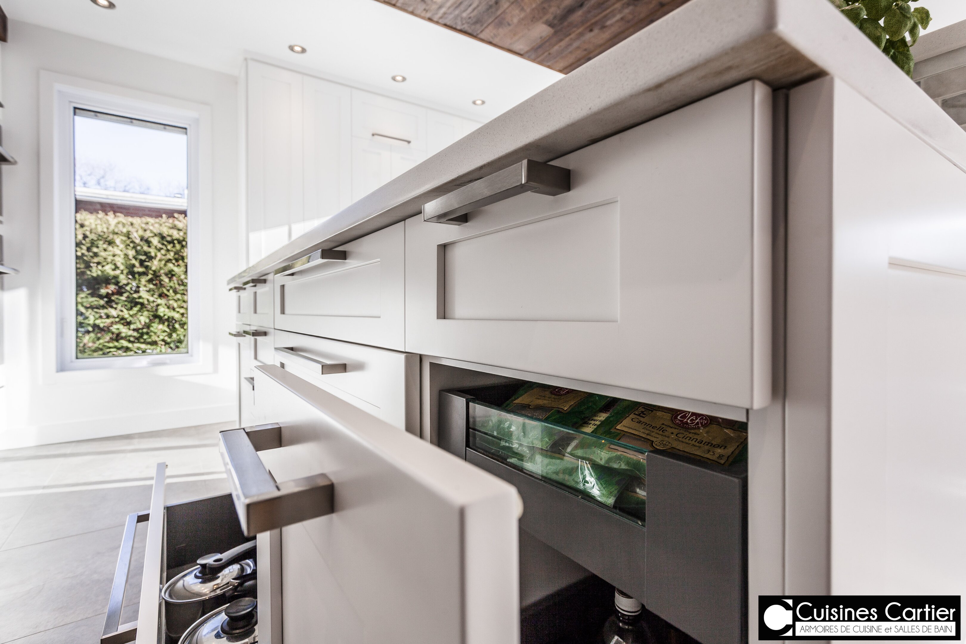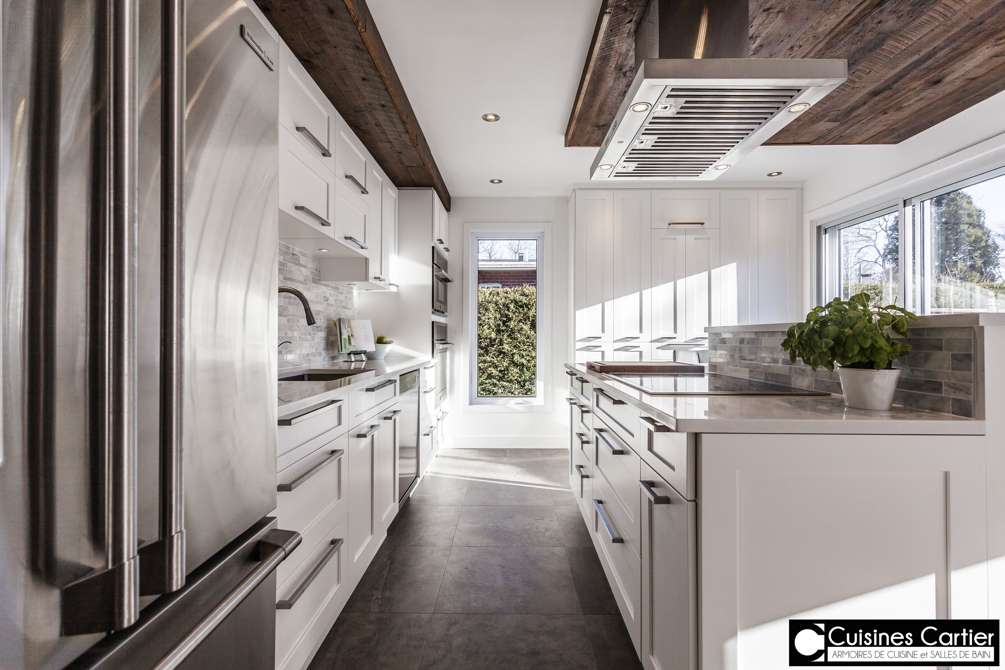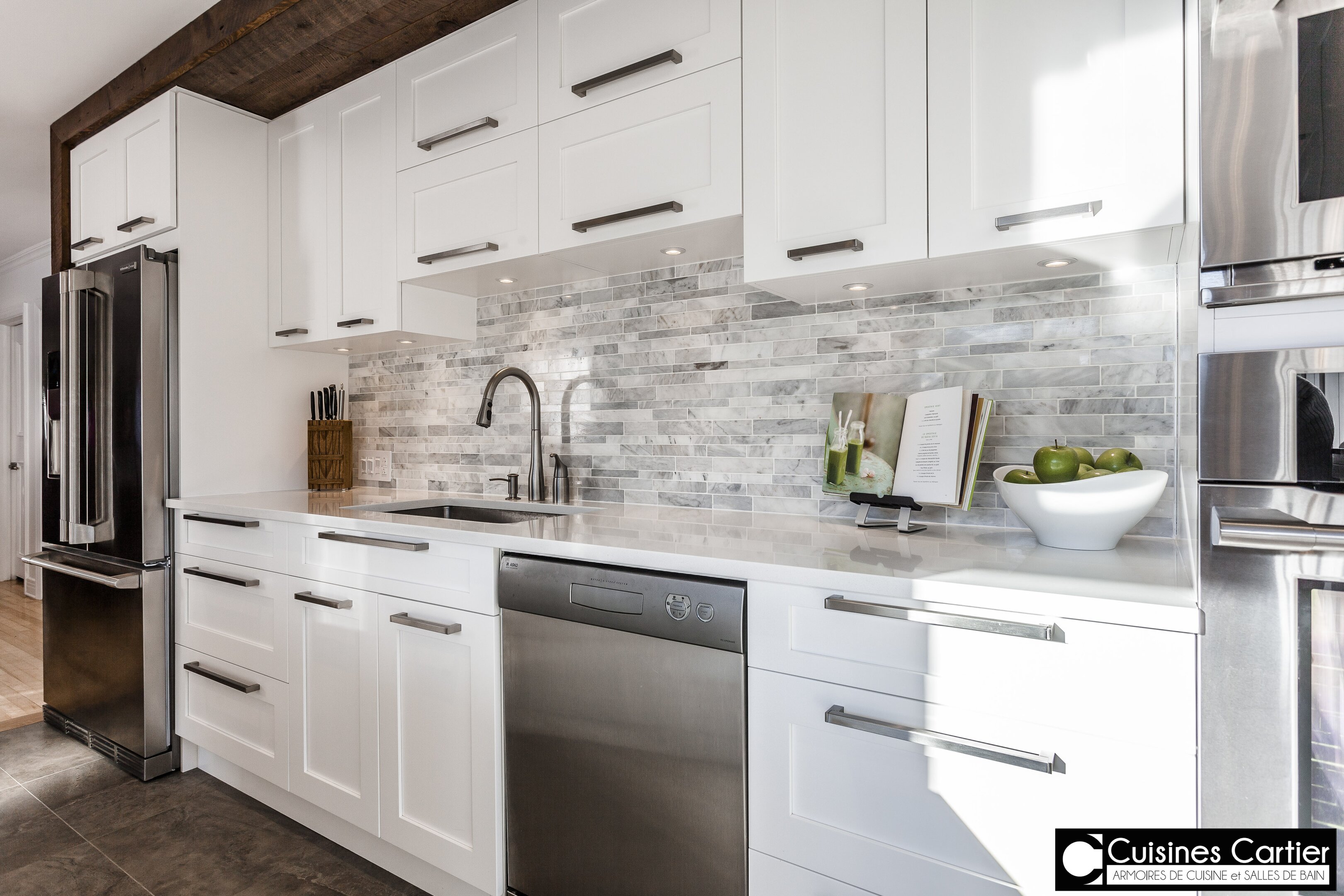 Le résutlat de cette cuisine est un savant mélange de neuf et d'ancien. Le choix des matériaux des armoires, du dosseret, de la céramique au sol, de la quincaillerie et des différentes fonctionnalités de cette cuisine est résolument contemporain tandis que les insertions de bois à l'allure brute apporte cette touche rustique qu'on aime tant.