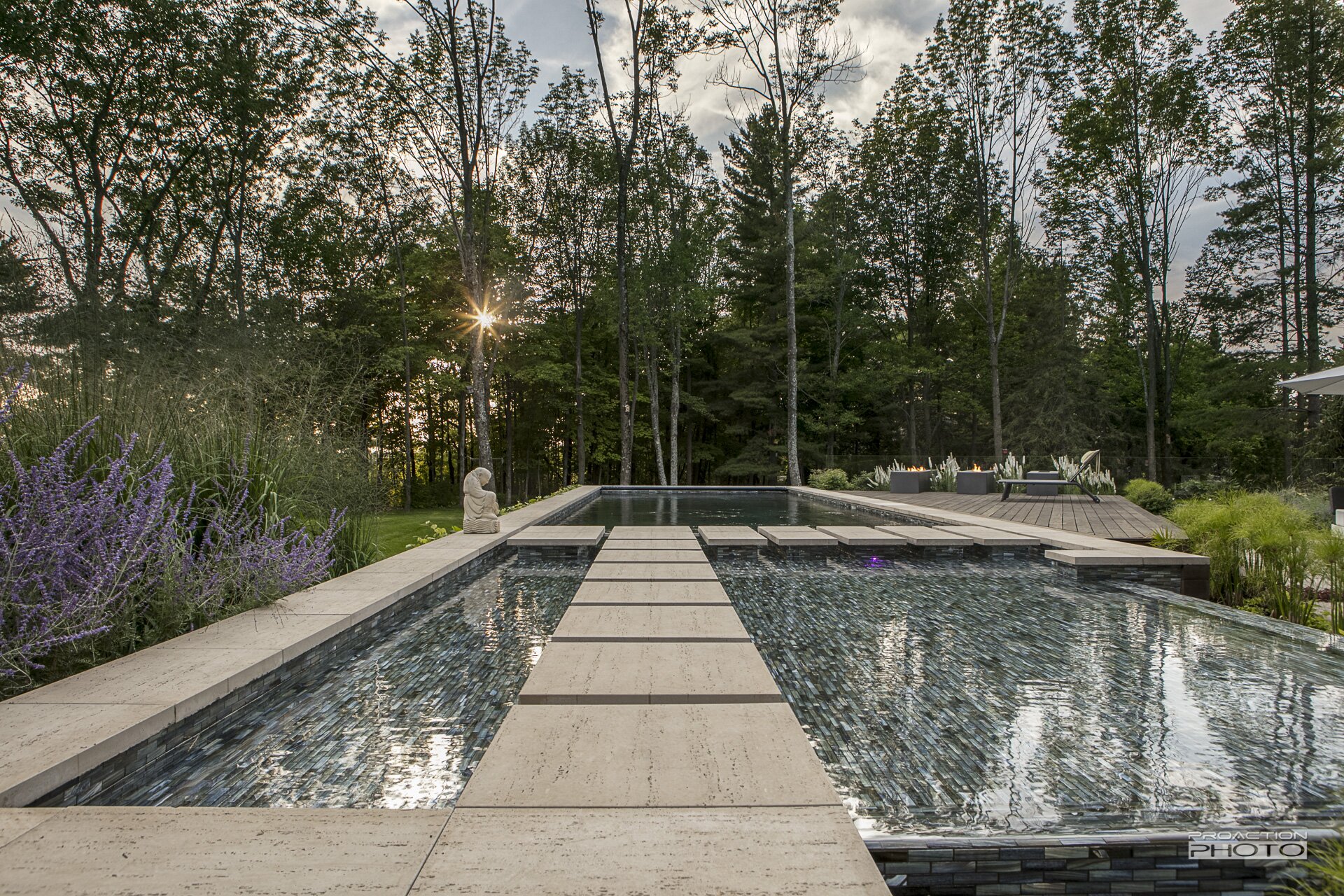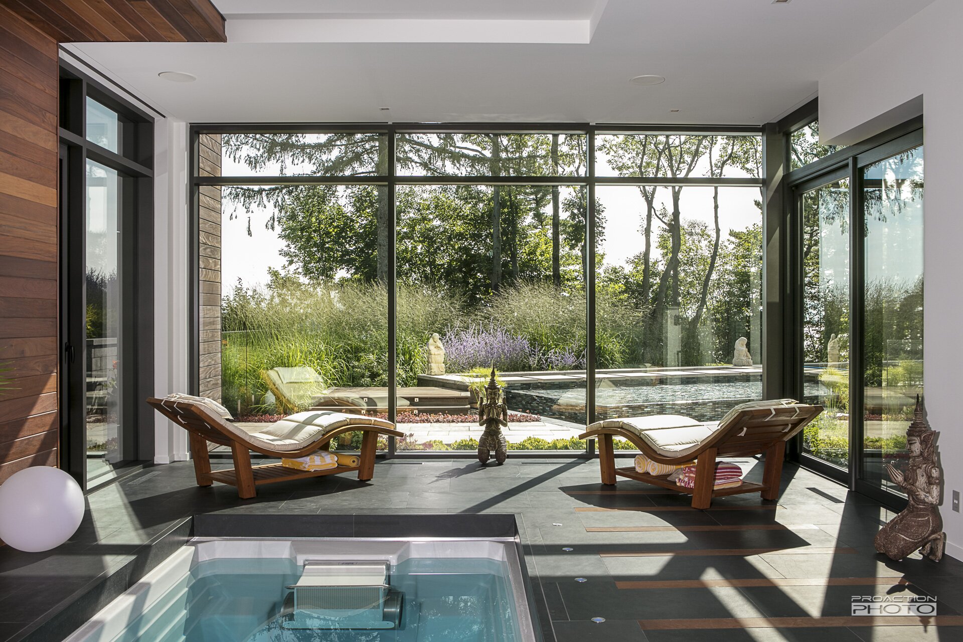 Un bassin décoratif se juxtapose au couloir de nage pour en allonger sa silhouette.
