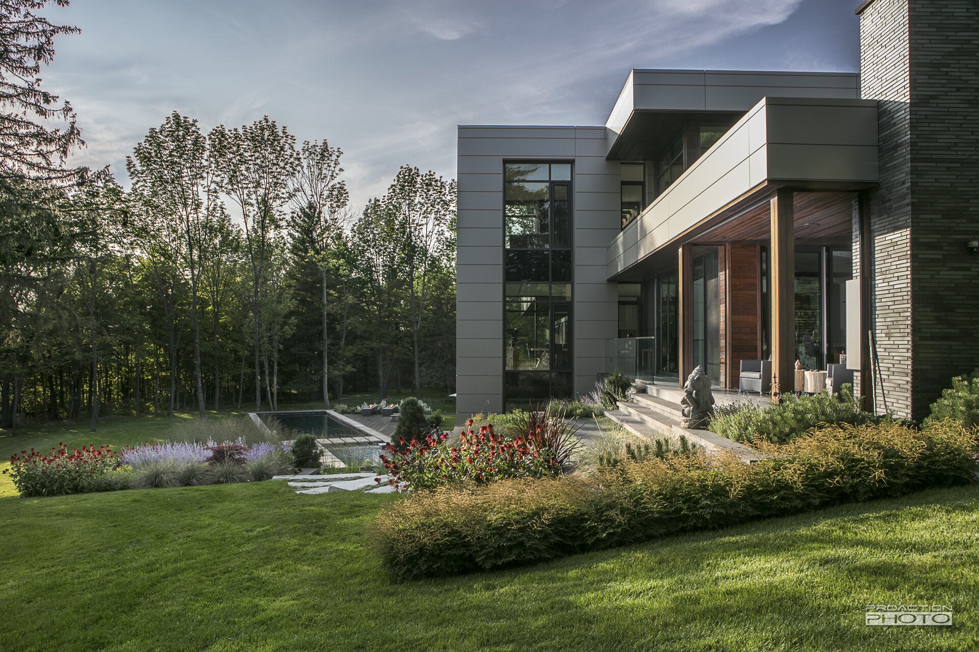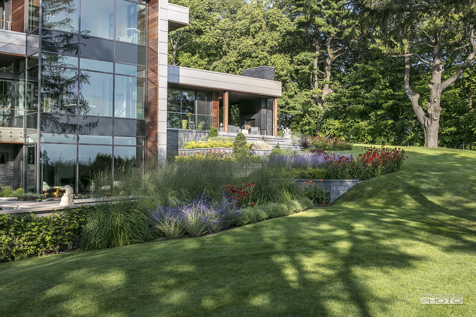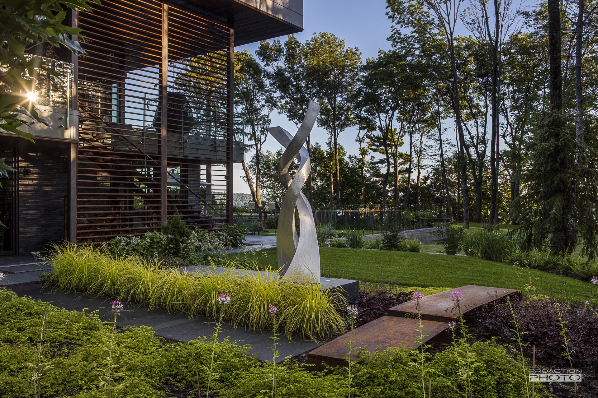 L’architecture de cette résidence unifamiliale a été conçue dans l’objectif d’apprécier la nature et de créer un sentiment d’union avec le paysage. Afin de traduire ces intentons de design dans l’architecture du paysage, nos équipes de conception et de réalisation ont mis leurs nombreuses années d’expérience à profit. La collaboration de l’équipe multidisciplinaire et l’investissement de cœur des clients ont permis la création de ce paysage sculptural.