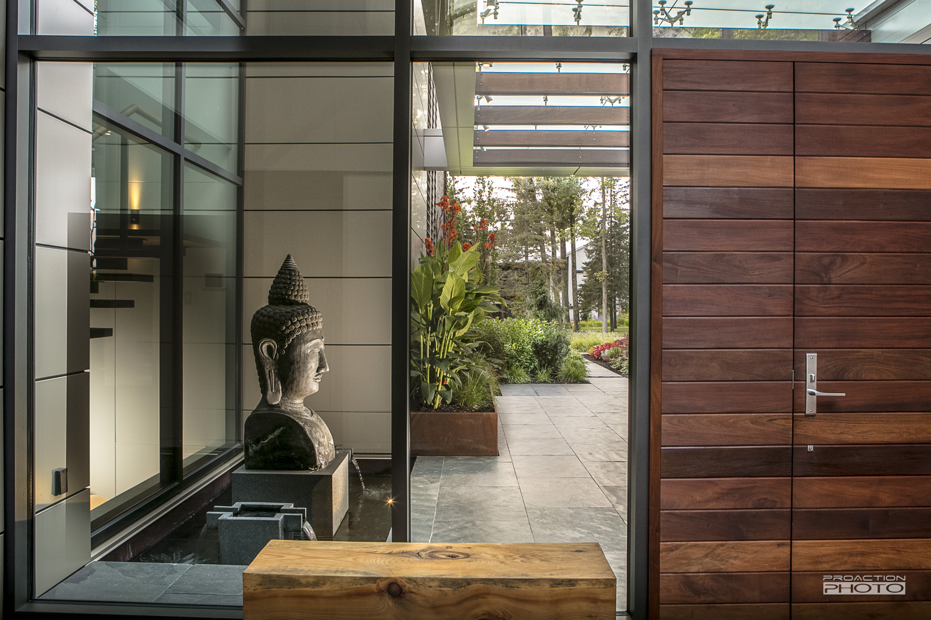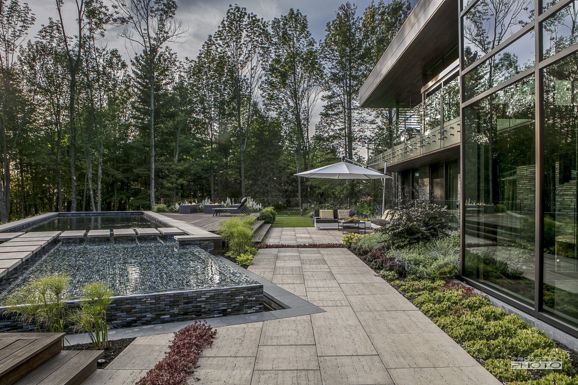 L’angle donné à la pièce d’eau en fait un point d’attrait et optimise l’aire de vie située entre la résidence et la piscine.