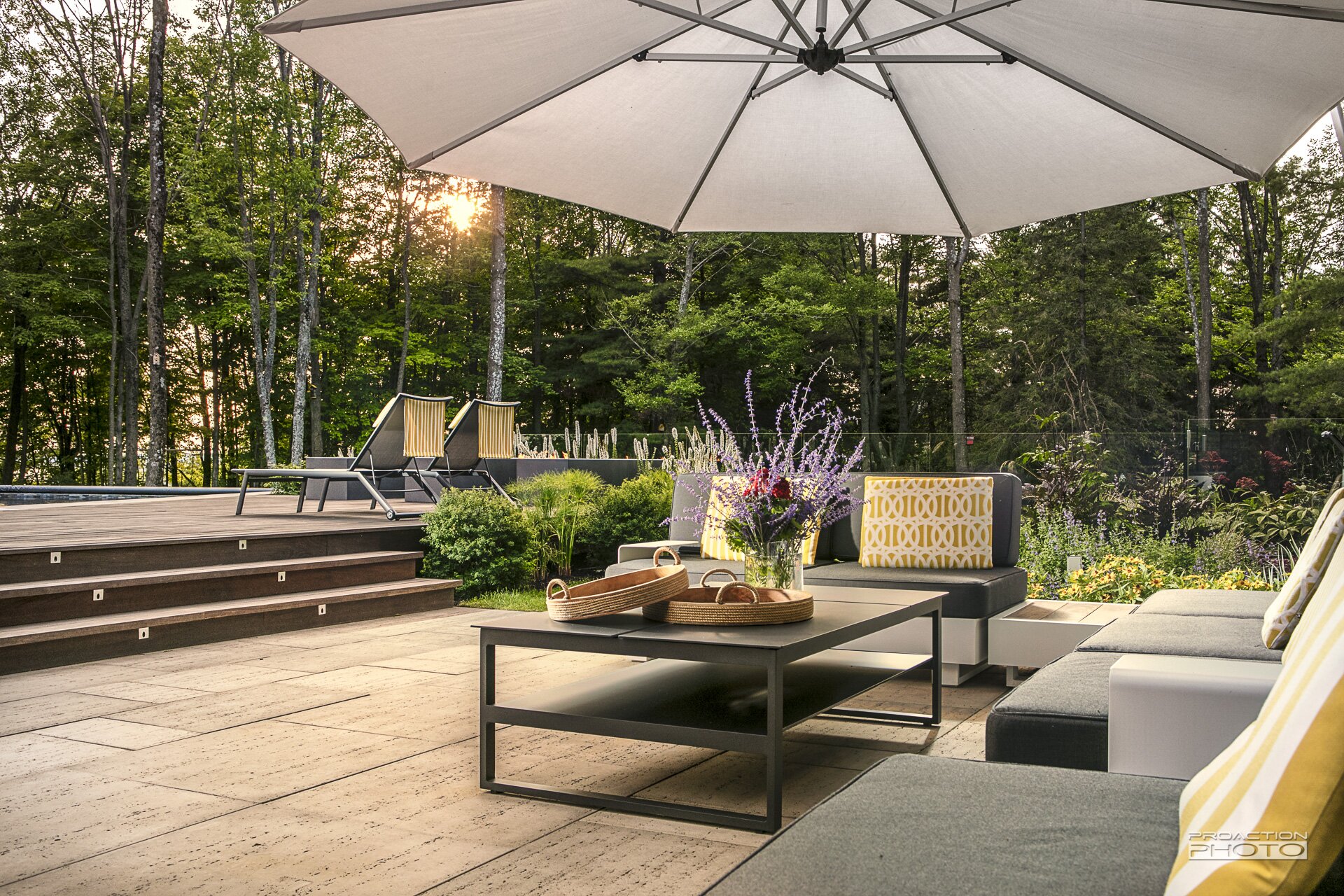 La composition qui englobe le bassin à débordement se transforme en tableau vu de cette aire de détente.