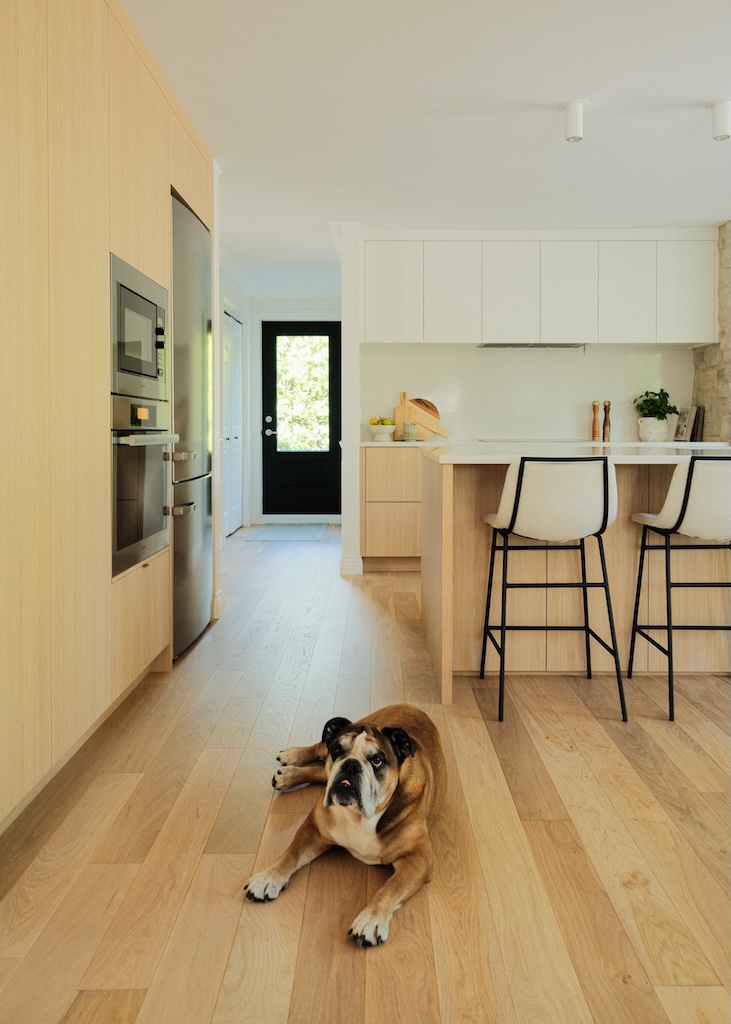 Dans la cuisine, armoires, comptoirs et couvre-planchers se composent de matériaux naturels, nobles et bruts créant instantanément une atmosphère conviviale.