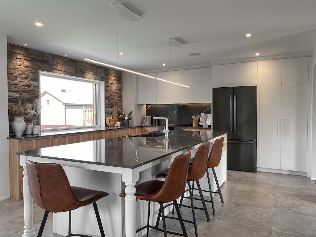 Chez Ma Cuisiniste, cette vision se traduit par des espaces à la fois contemporains et accueillants, où chaque détail compte. Les surfaces mates et les lignes raffinées s’accompagnent d’un éclairage intégré subtil, révélant la richesse des matériaux et la précision du design. Les électroménagers s’intègrent avec discrétion, tandis que les matériaux contemporains (bois d’ingénierie, néolaminé, surface solide, porcelaine et pierre sintérisée) assurent une durabilité exceptionnelle sans compromettre l’esthétique.