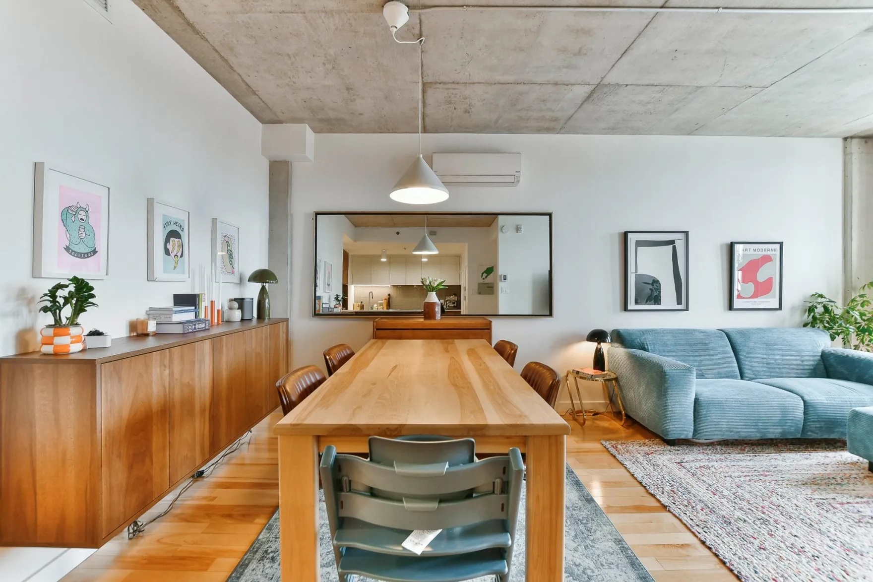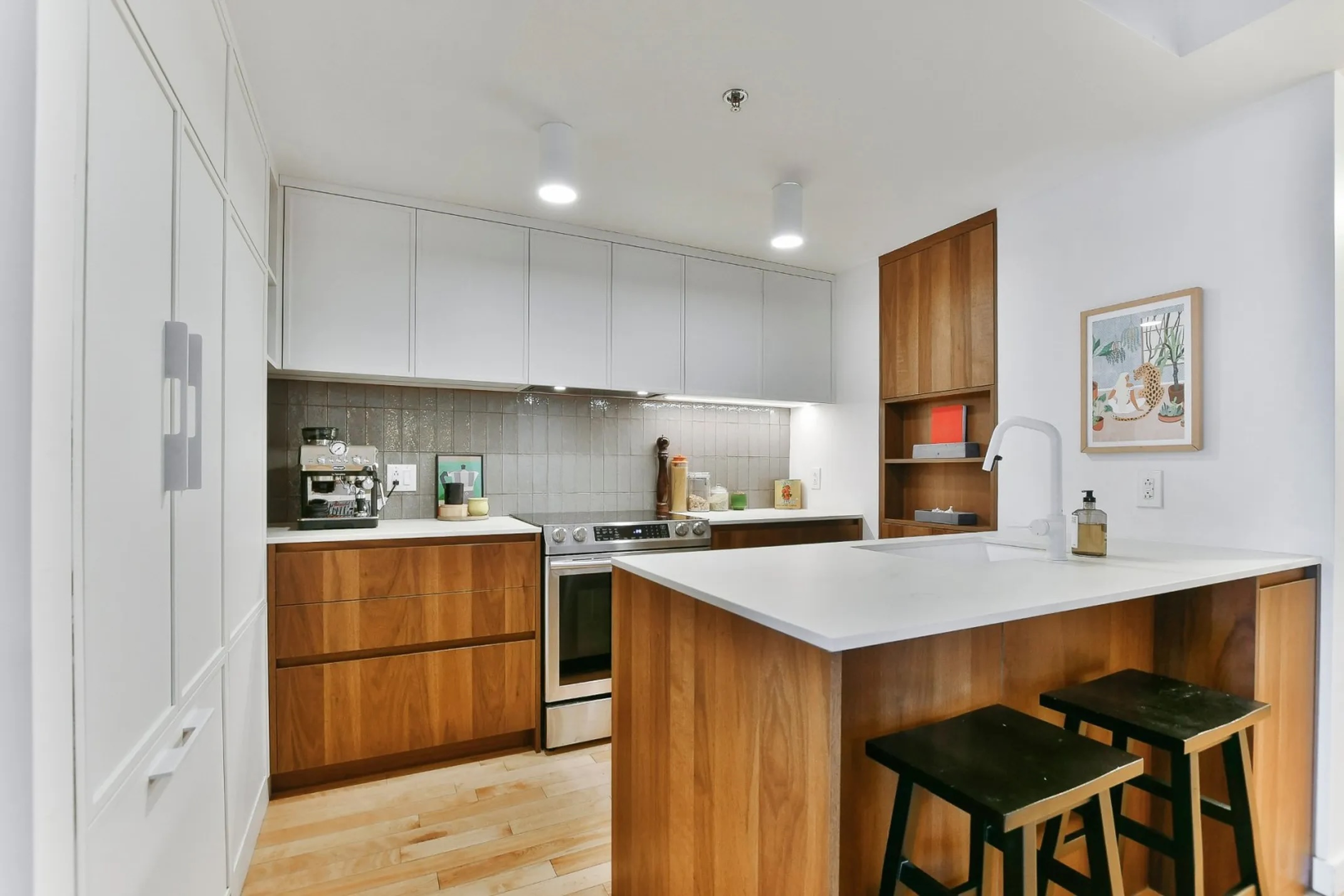 Ce condo se distingue par ses grandes fenêtres qui laissent entrer une abondance de lumière naturelle, créant une ambiance conviviale et douce dès le premier pas à l’intérieur. Le salon à aire ouverte, harmonisé à une cuisine soigneusement aménagée, en fait un espace idéal pour recevoir comme pour se détendre après une journée bien remplie à Montréal.