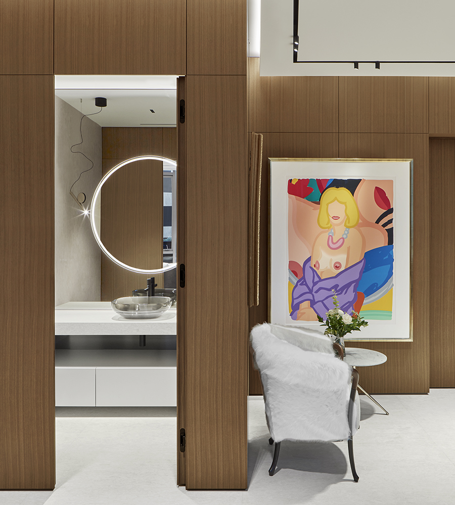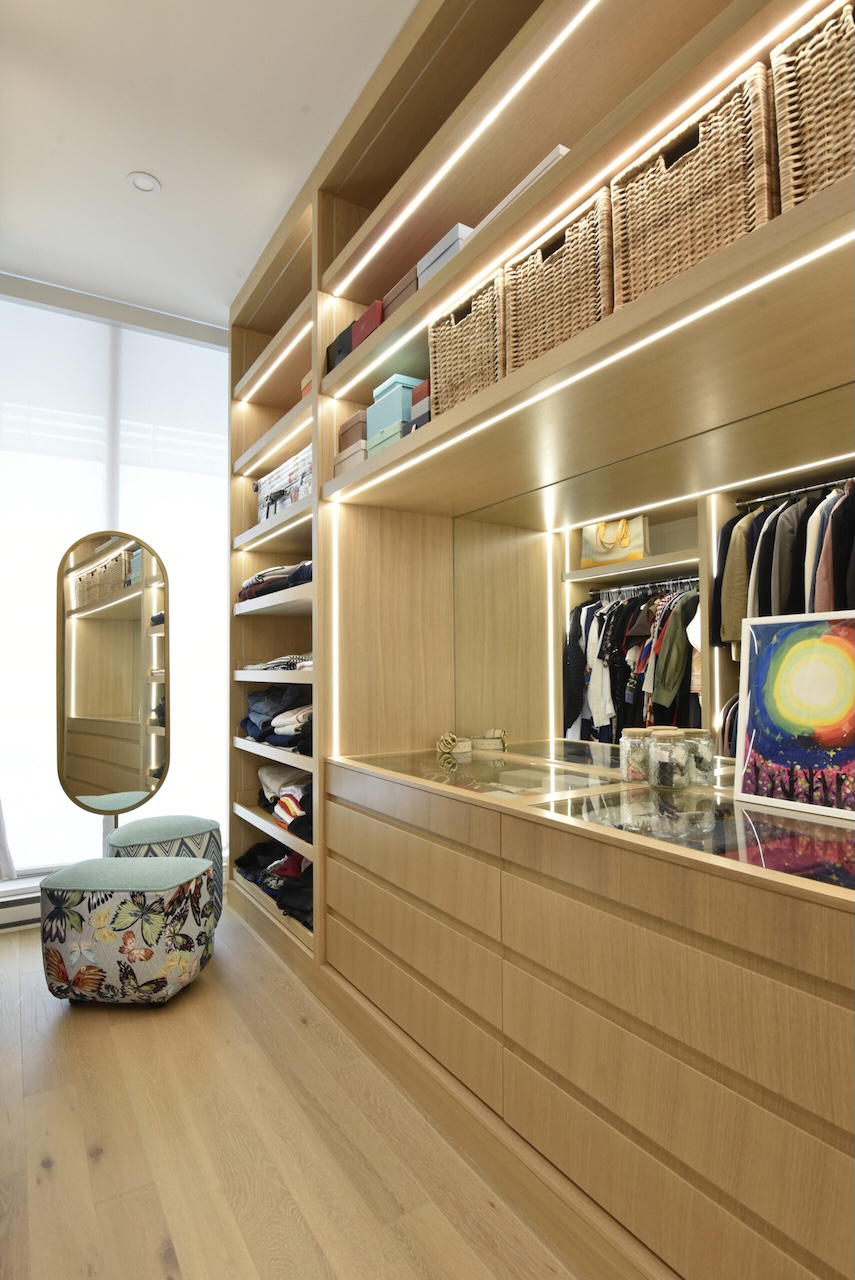 C’est dans la garde-robe du projet Espace Finesse que l’intégration des bandes DEL a transformé le mobilier sur mesure. Entre délicatesse et prouesse technique, notre intention était d’obtenir un espace convivial et fonctionnel. En ajustant l’intensité, selon le moment de la journée, les lignes de lumière sculptent l’ambiance, révélant ainsi les textures et offrant une esthétique globale. Subtiles mais essentielles, ces sources lumineuses créent un effet théâtral. Une conception minutieuse signée par Philippe Harvey Designer.