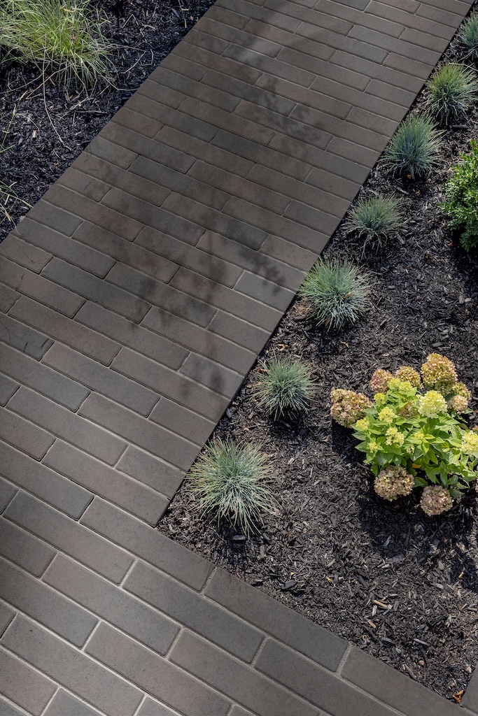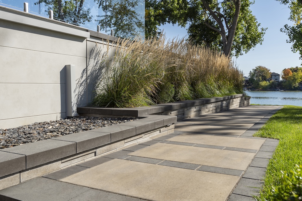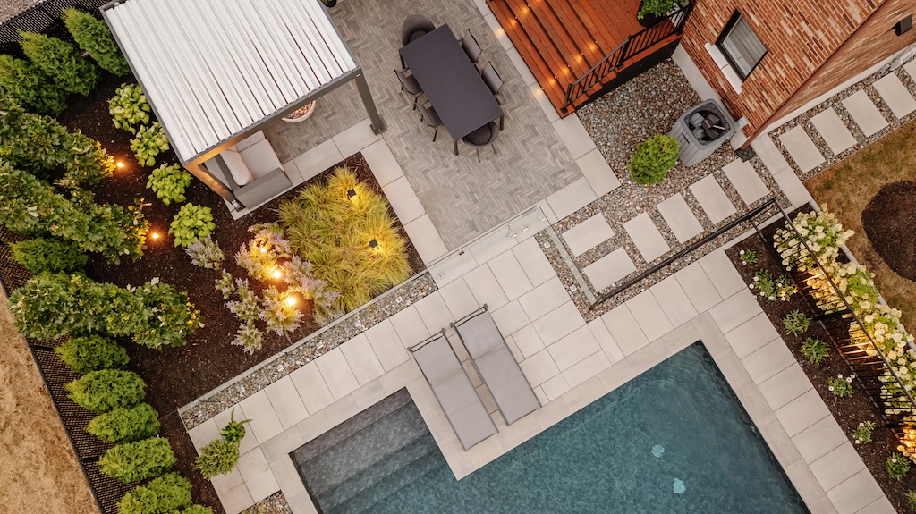 En 2026, les aménagements paysagers continuent d’évoluer vers des espaces à la fois réfléchis, fonctionnels et épurés. Une tendance forte que nous observons est l’utilisation d’une combinaison de dalles de dimensions et formes variées, créant une texture rappelant celle d’un « tapis ». Cette approche se prête particulièrement bien aux zones foyer ou aux espaces lounge, où elle organise les zones de vie, tout en apportant une composition visuelle intéressante. Par exemple, le pavé en chevron, comme dans le projet Ombre Urbaine, demeure un choix prisé pour introduire rythme, mouvement et profondeur dans un aménagement.