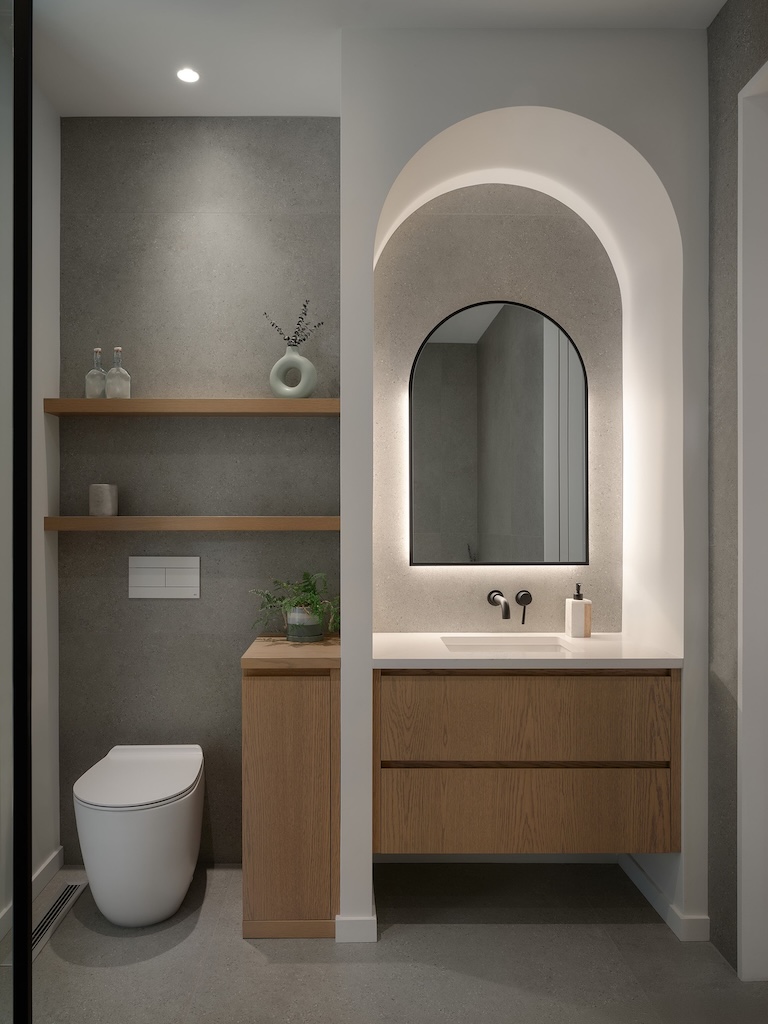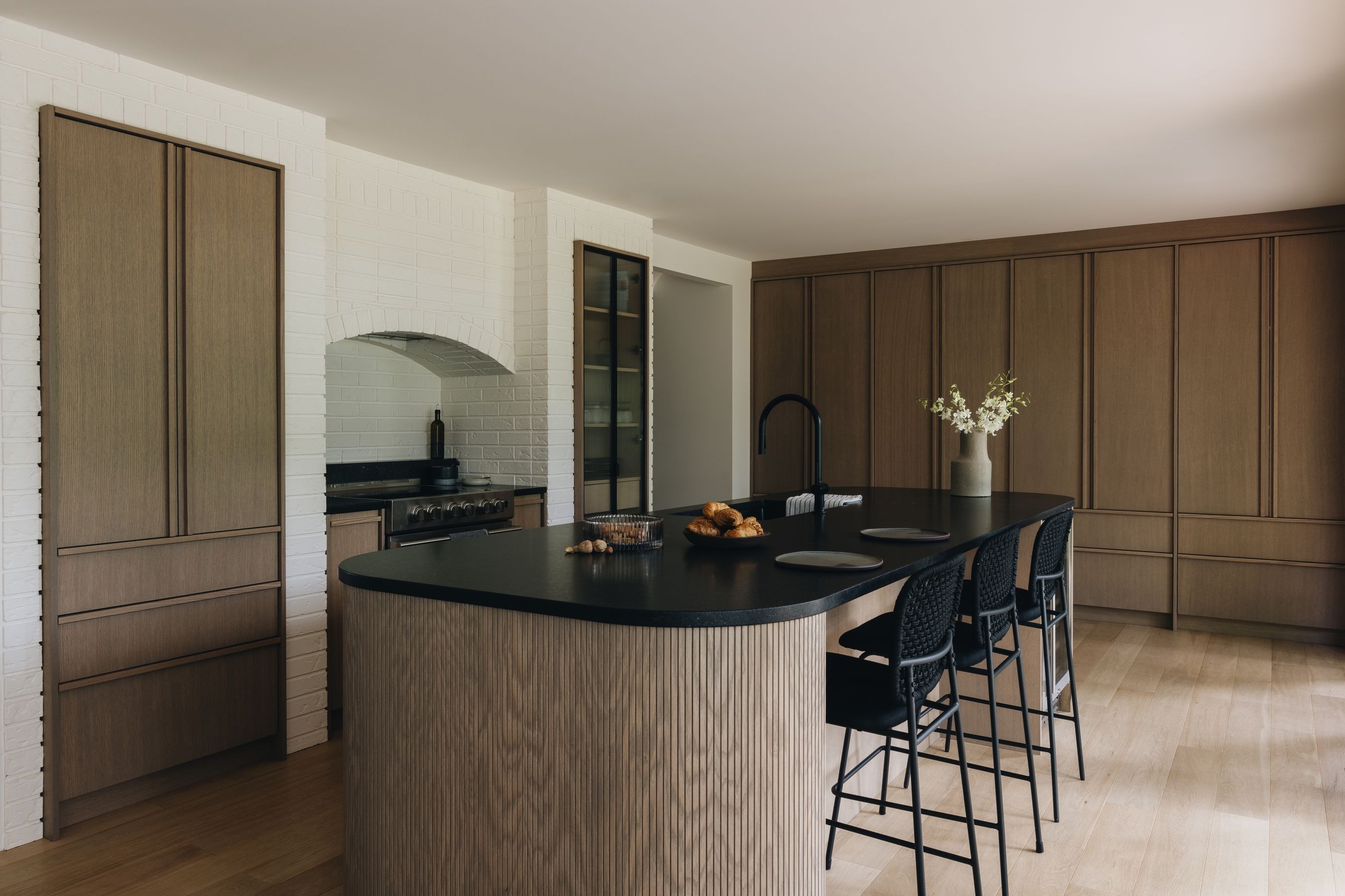 Ce n'est pas un hasard si cette cuisine a remporté un tel succès auprès du public. Elle a également été la lauréate d'un Prix Monuma dans la catégorie Design - Cuisine 80 000$ et moins. Cette cuisine mêle avec finesse l’esprit Japandi et une touche éclectique. Les panneaux de chêne blanc dissimulent ingénieusement les zones techniques pour préserver la pureté des lignes, tandis que l’îlot en granit Cambian noir, tout en courbes, impose une présence raffinée. La grande fenestration inonde l’espace de lumière, mettant en valeur la brique d’origine et son arche repensée. Le résultat : une pièce chaleureuse, moderne et parfaitement en accord avec l’âme de la maison.