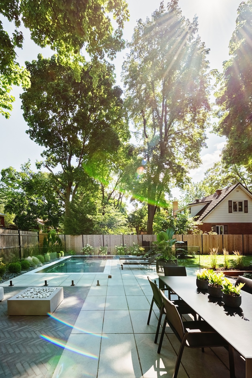 Ce projet coup de coeur crée un agencement harmonieux entre le bois et le noir. La zone foyer en pavés nstallés en chevron est entourée d'une terrasse en grandes dalles gris pâle qui structurent la cour, la rendent immense et arérée. La clôture de verre permet de profiter de la piscine creusée aux allures d'oasis entourée de verdure. Le soir, l'espace prend vie grâce à un jeu d'éclairage intégré qui met en valeur les matériaux et les végétaux.