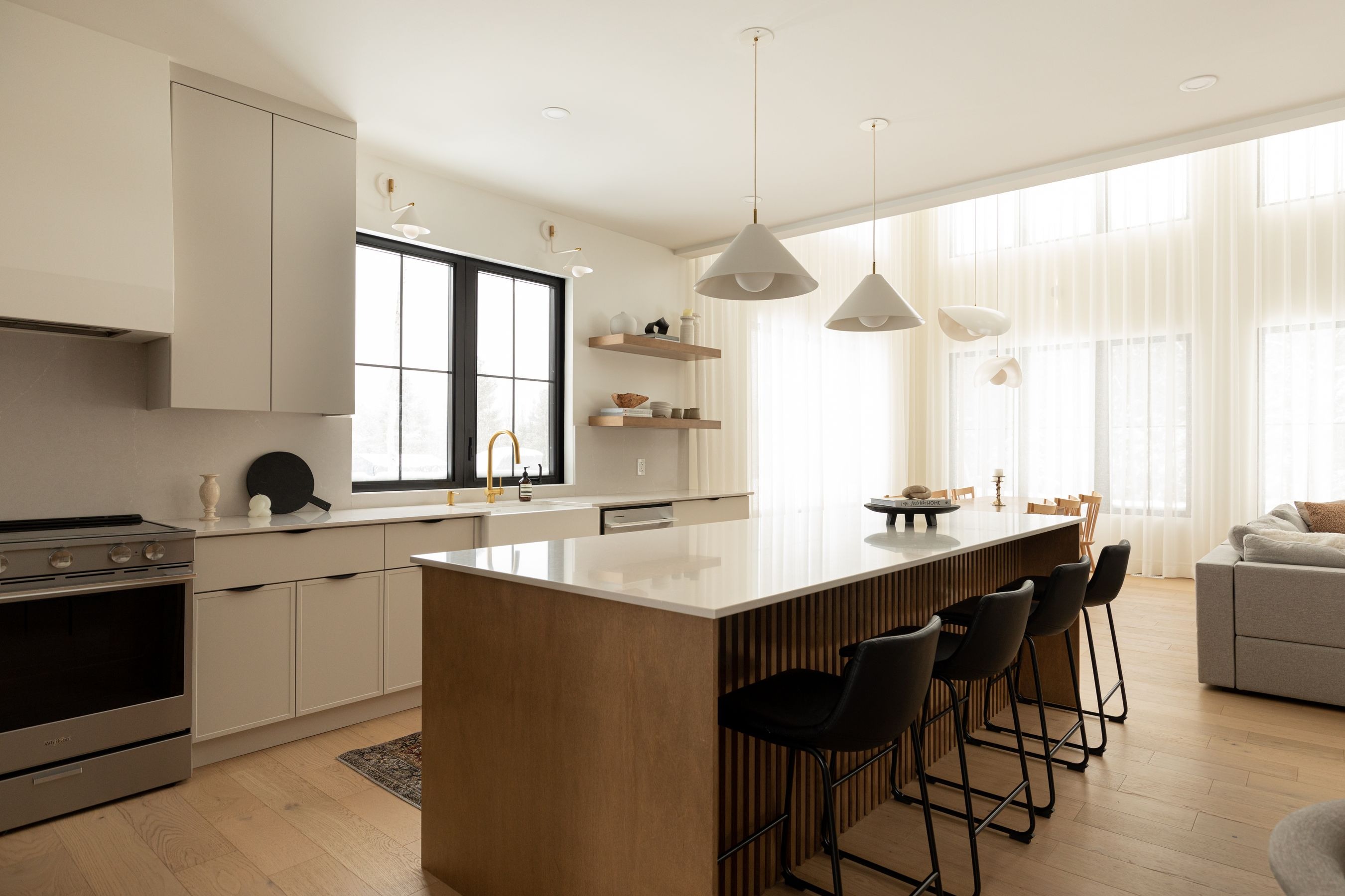 La cuisine de cette résidence conçue par M Ton Intérieur et réalisée par Armoires Cuisines Action baigne dans une lumière douce qui met en valeur ses lignes nettes . L’îlot, rythmé de lattes verticales, attire immédiatement le regard, tout comme les étagères et la petite bibliothèque ouverte où objets et inspirations trouvent leur place. Le coin bureau, intégré avec finesse, rend l’espace aussi polyvalent qu’accueillant. Et que dire des luminaires ? Leur présence soigne tout l’ensemble et signe le caractère du lieu.