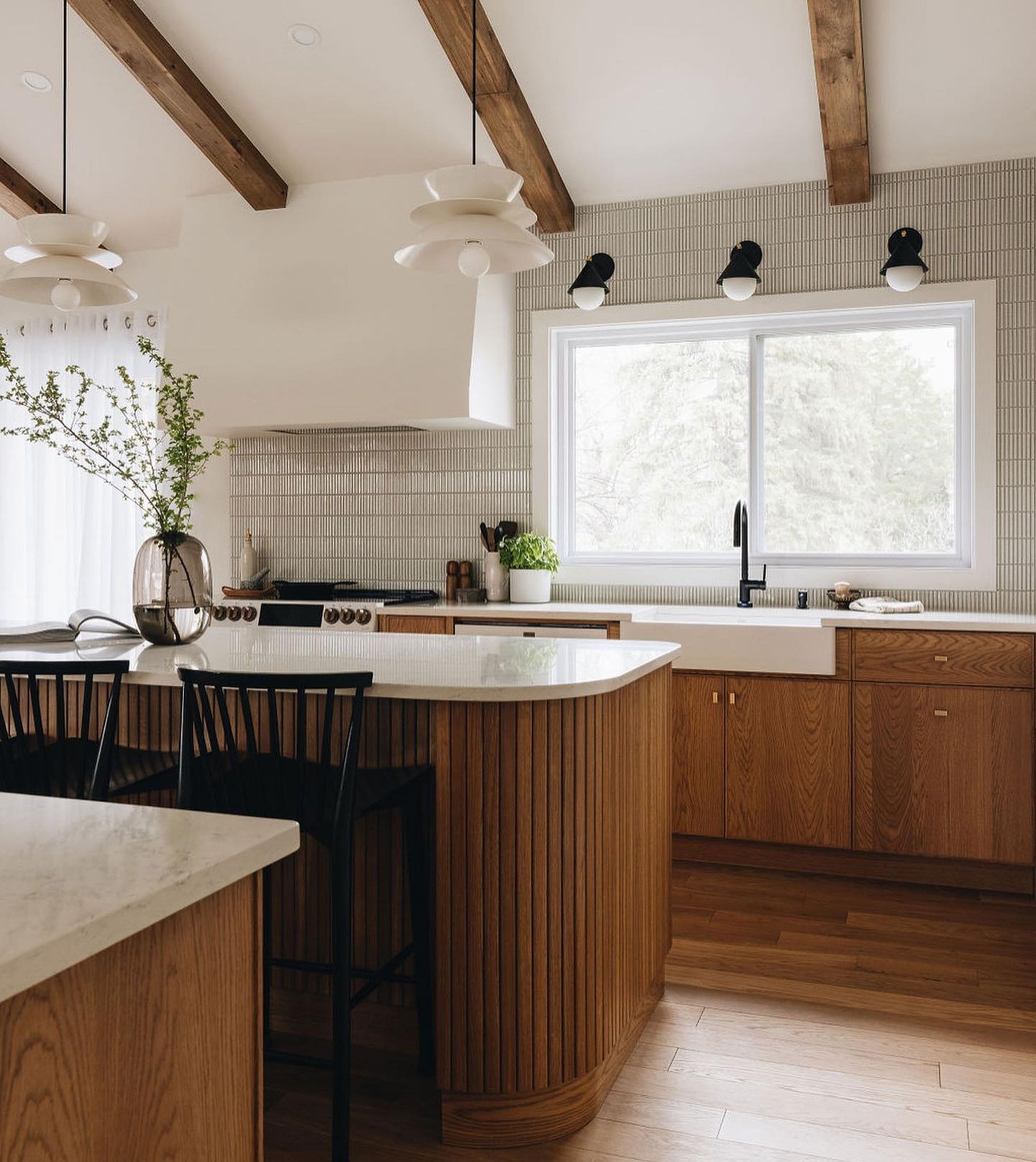Les internautes ont adoré cette cuisine où chaque détail respire le travail artisanal. L’îlot arrondi en languettes de chêne massif vole littéralement la vedette, façonné avec une précision presque méditative. Les poutres apparentes, la tuile kit kat et les poignées dorées ajoutent rythme et finesse, tandis que les armoires et le plancher en chêne ancrent l’ensemble dans une modernité chaleureuse et intemporelle.